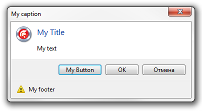 As can be seen, this complex dialog, which contains custom main icon, custom button (which is specified to be a default button) and a footer with configured icon, is executed using simple and clean code. Builder structures provides a huge sets of overloaded methods, which allows to specify: