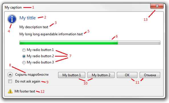 6)Progress bar. Has a variety of properties, such as Min, Max, Position, State and Marquee. For showing progress bar the user should include tdfShowProgressBar value into Flags set property. The timer feature can be used to update progress bar state during dialog execution (look at Advanced Features for more information).