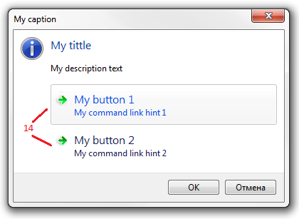 14)Custom buttons shown as command links. Task dialog allows to show custom buttons as command links. To achieve this tdfUseCommandLinks dialog flag should be used. Usually command links show provided by OS standard arrow icon, however, the user can hide these icon using tdfUseCommandLinksNoIcon dialog flag. Command links provides additional hints, which are longer text descriptions. They can be specified using CommandLinkHint button property.